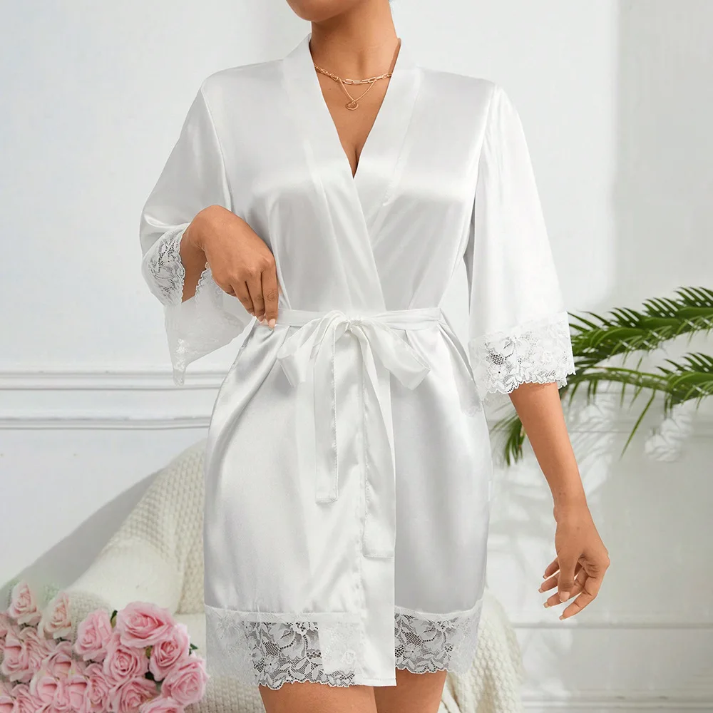 Crafted from smooth, silky satin, the robe drapes with a soft luster, while the delicate lace trim—often detailing the neckline, sleeves, or hem—provides a sensual, luxurious contrast in texture. The short, kimono-style sleeves and adjustable satin belt ensure a comfortable, easy-to-wear fit that still feels utterly chic. Designed as essential Bridal Loungewear, this robe is ideal for "getting ready" photos on the wedding morning or as a thoughtful, classic Bridesmaid Gift. Its timeless design ensures it remains an elegant piece of nightgown and sleepwear long after the celebration ends.